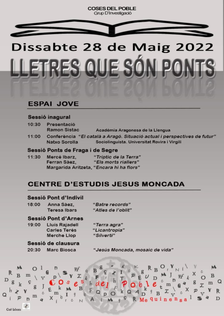 El dissabte 28 de maig de 2022 es va viure una marató literària a Mequinensa. Coses del Poble va organitzar l’acte “Lletres que són Ponts” amb l’objectiu de difondre entre el veïnat diferents obres i autors originaris o veïns de les comarques de la Franja i veïnes de Catalunya. Els autors locals, malgrat la qualitat de la seva obra, en general resten al marge dels grans circuïts de distribució, fent difícil que siguin coneguts pels lectors de les nostres contrades, i més encara quan escriuen en català, una llengua que a la Franja està experimentant problemes en el seu ús social. L’activitat es va oferir com un aparador de la creativitat literària de les nostres terres, al temps que una plataforma de reflexió sobre les necessitats i potencialitats del sector.